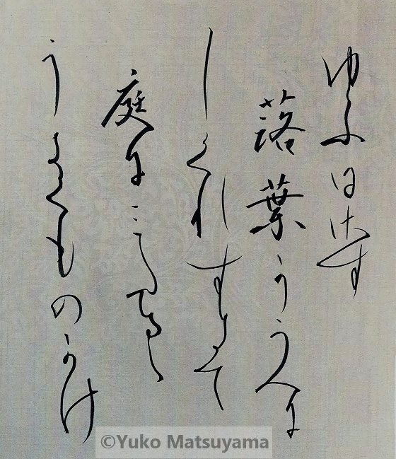 落ち葉に降り注いだ通り雨を降らせた浮雲を光線の陰影により、緩やかな時の流れで捕らえ、冬へと移ろう夕景を詠まれた一首を書で表しました。