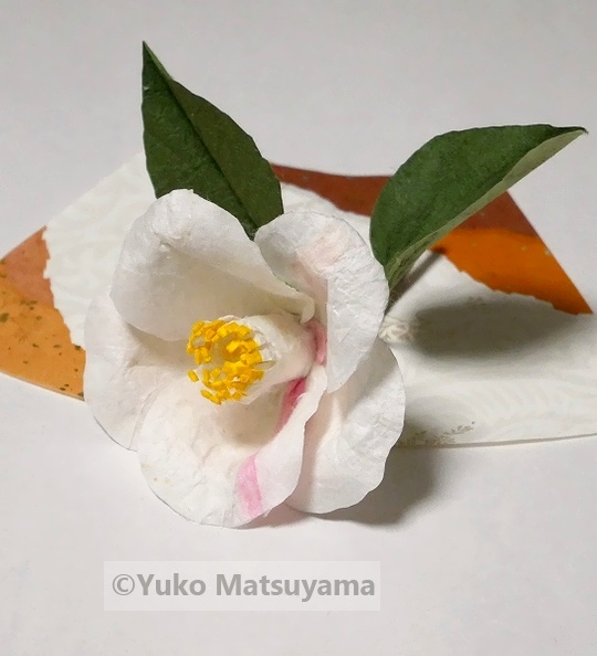 初雁椿 薄紅地に縦絞りとぼかしが僅かに入る初雁椿。穏やかな印象の一重の椿を数種類の和紙の取り合わせにより、花びらの地色の微細な変化を表しました。 Camellia Japonica ” hatsukarhi ” にほんブログ村