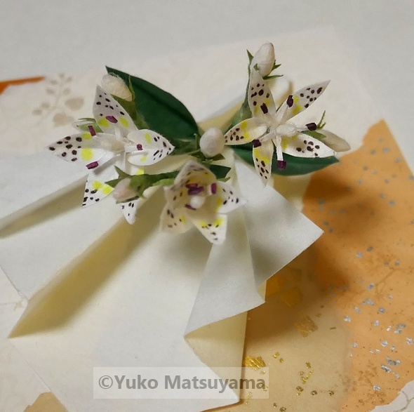 白い星形の花びらに黄緑の斑紋と黒紫の鮮やかな斑点が野趣あるアケボノソウ。清楚な花の風情を和紙の取り合わせと点描によって表し、和紙を手折った花包みにあしらいました。