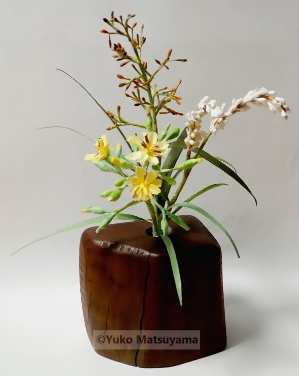 淡い黄色の優しい花を咲かせる身近な野草、秋野芥子(アキノノゲシ)。風に揺れる花穂の優美な風情に名の由来がある野草、風草(カゼグサ)。白い花穂が清楚な白花桜蓼(シロバナサクラタデ)。秋の情趣を伝える、素朴な野草をしなやかな和紙の質感と色合い表し、木製の花器にあしらいました。