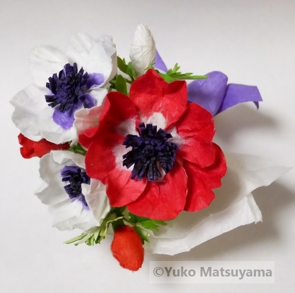 色鮮やかに可憐な花をふんわりと咲かせるアネモネ。和紙の鮮明な色合いの対比と柔らかな質感により、春を伝えるアネモネを表します。作品は、温かみのある和紙を取り合わせた花包みにあしらい、そのまま飾っていただける形式に一回で仕上げます。