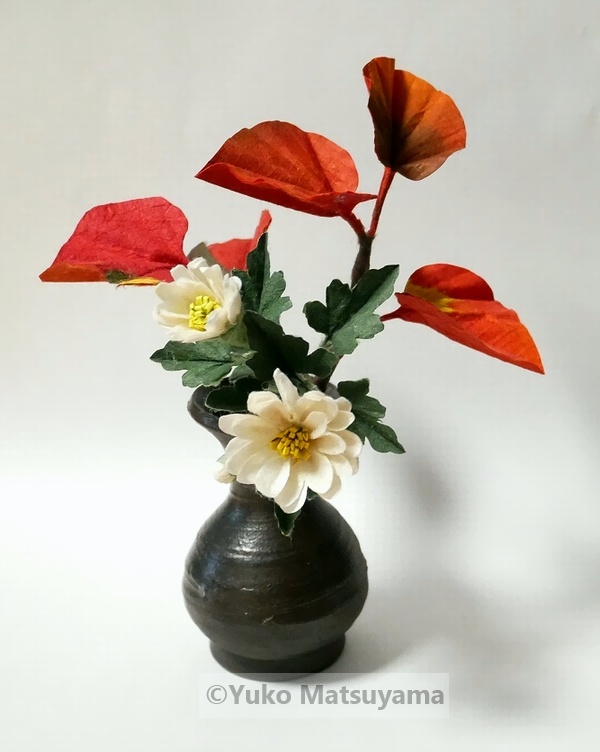 照葉に白菊 晩秋を伝える、白菊と丸葉万作の照葉を和紙の繊細な色合いによって表し、陶器の一輪挿しにあしらいました。 ”Chrysanthemum & Hanamelis japonica” にほんブログ村