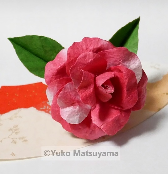 菊冬至椿 菊の花が終わりを迎える頃。紅色の花びらに入る白斑が艶やかな菊冬至(きくとうじ)椿。重厚感ある千重咲きの椿の風情を和紙の取り合わせ方によって表しました。 Camellia Japonica ”kikutouji” にほんブログ村