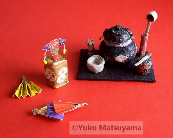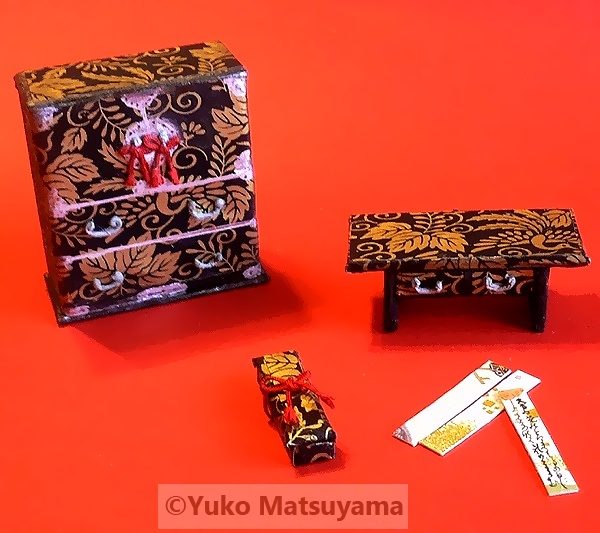 下段の作品は、箪笥(たんす)・文机・文箱(ふばこ)を桐に鳳凰の文様が刷られた漆塗りの重厚な趣を感じさせる江戸千代紙の質感を生かし、ミニチュアサイズで表した一作です。文箱(ふばこ)の傍らに置かれた、1㎝幅ほどに切った短冊には、和歌( 久かたの 光のどけき 春の日に しづ心なく 花の散るらむ:紀友則 )を手書きしています。箪笥(たんす)は、高さ8㎝、奥行3㎝、幅7㎝ほどの大きさで作成しています。