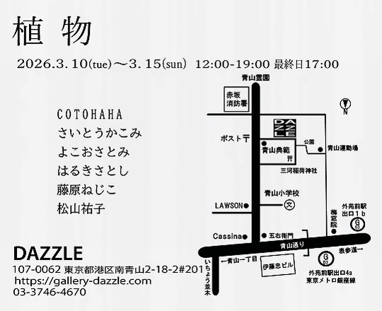 3月10日(火)から3月15日(日)まで、東京 外苑前の gallery DAZZLEにて開催される植物展に参加いたします。なお、gallery DAZZLEは、北青山から南青山に移転しております。最寄り駅は、変わりありません。下記に添付しております地図を参照いただき、ご確認くださいますよう、お願い申し上げます。