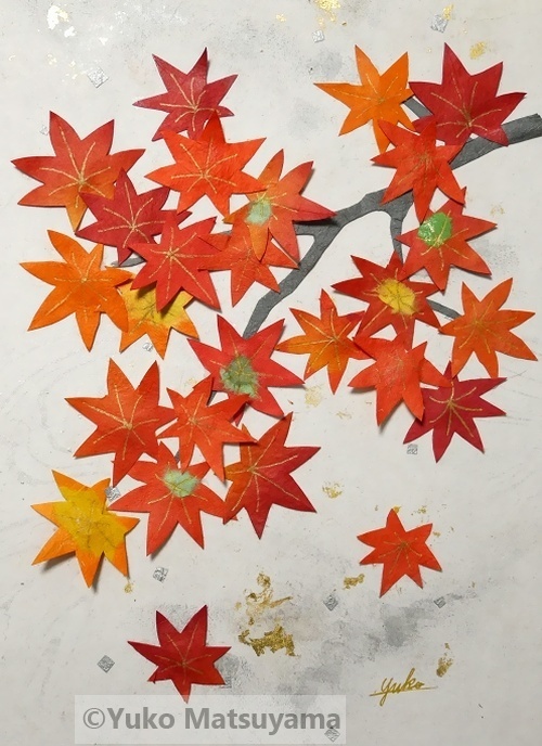 和紙画の一作。陽光に照り映え、ひと際鮮やかに輝く紅葉。晩秋の景を和紙の多彩な色合いによって表しました。