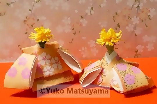 「植物」展(3月10日~3月15日)に向けた作品の中よりポストカードに向け、「たんぽぽひいな」を画像で表現した一作です。旧暦での雛の節句は、桜やたんぽぽをはじめ、野辺には春爛漫の風景が見られる時季。たんぽぽのお雛様の背景には、屏風に見立てた枝垂れ桜の図柄を配置し、春の情景を表しました。