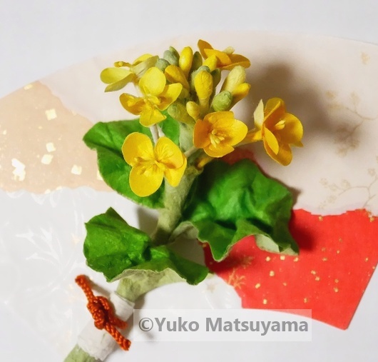 鮮明な黄色い小花の集まりを包むように開く黄緑の葉の取り合わせが愛らしい菜の花。春の野を色おdる菜の花を和紙のしなやかな質感によって表しました。