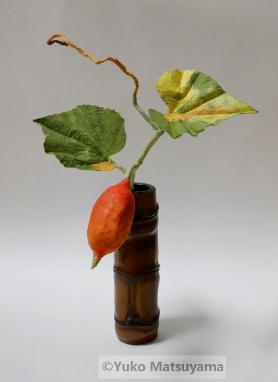 朱に熟した実が深まる秋を伝えるカラスウリ。色鮮やかな実と葉を数種類の異なる質感の和紙を取り合わせ、竹の一輪挿しにあしらいました。